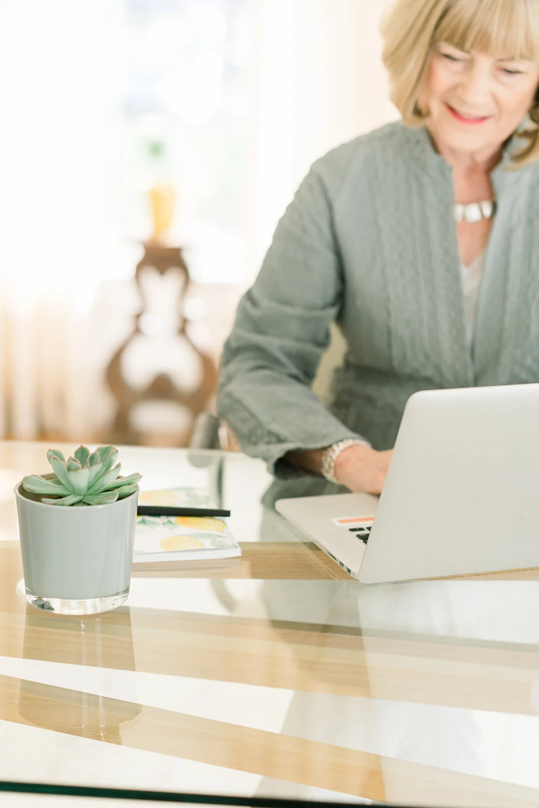 During the shoot planning process for Cindy Stack, a life coach specializing in career transitions and leadership development, we worked with her newly created brand playbook designed by Kristen Fulchi. This was so helpful because we were able to ensure that the images would have a cohesive look that blended seamlessly with her new website. The playbook inspired the fresh feel of her shoot, bright and calming, employing lots of soothing greens and cheery yellows in the props, the setting and Cindy’s outfits.