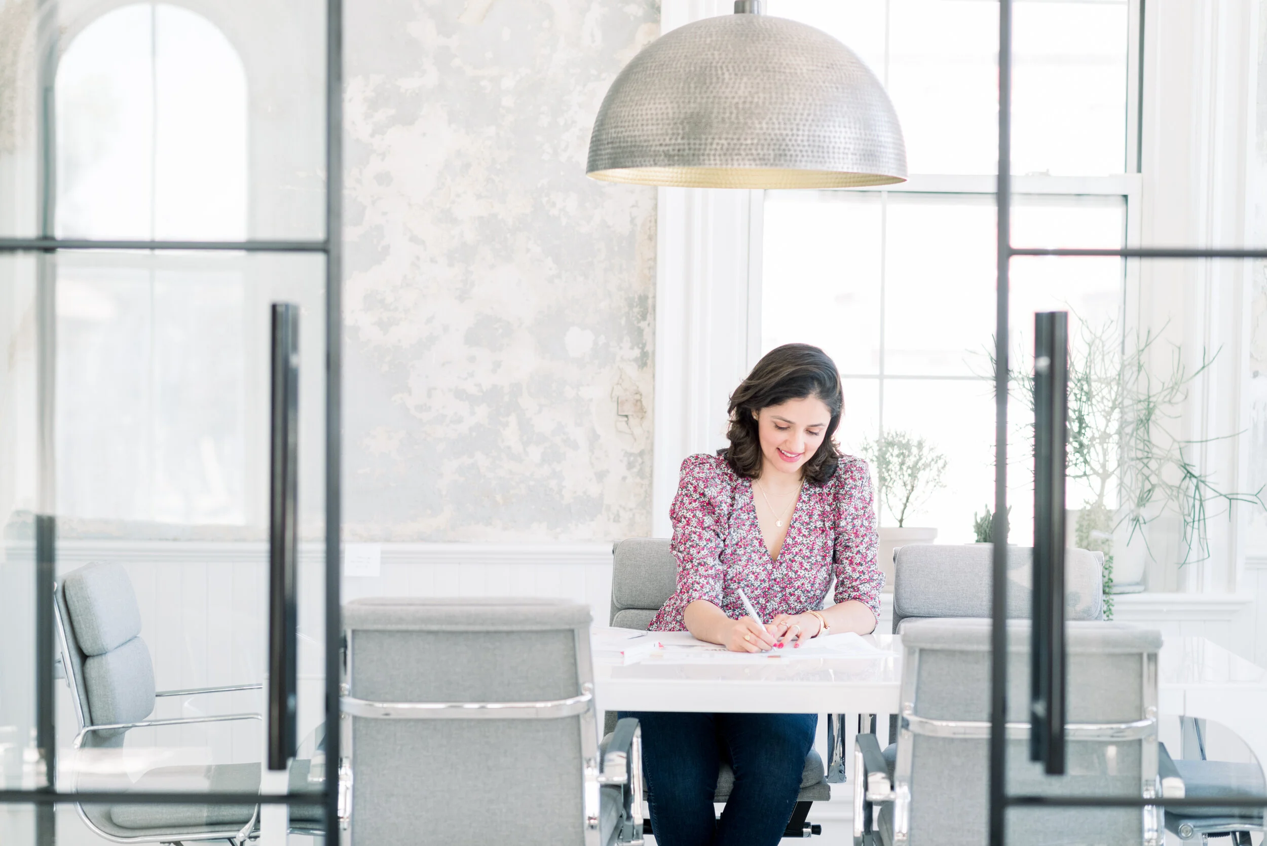 I love the natural light of this space. I also love the contrast of the modern feel with the character and charm of the historic building at The Newburyport Studio. With the light-colored and exposed brick walls, it is a neutral space so it will work for most brands. This studio also offers several options for capturing stories since it has an office setting for professional shots but it also has the fun swinging chair and classic leather couch for more of those lifestyle moments like the ones I shot for Fernanda Melo.