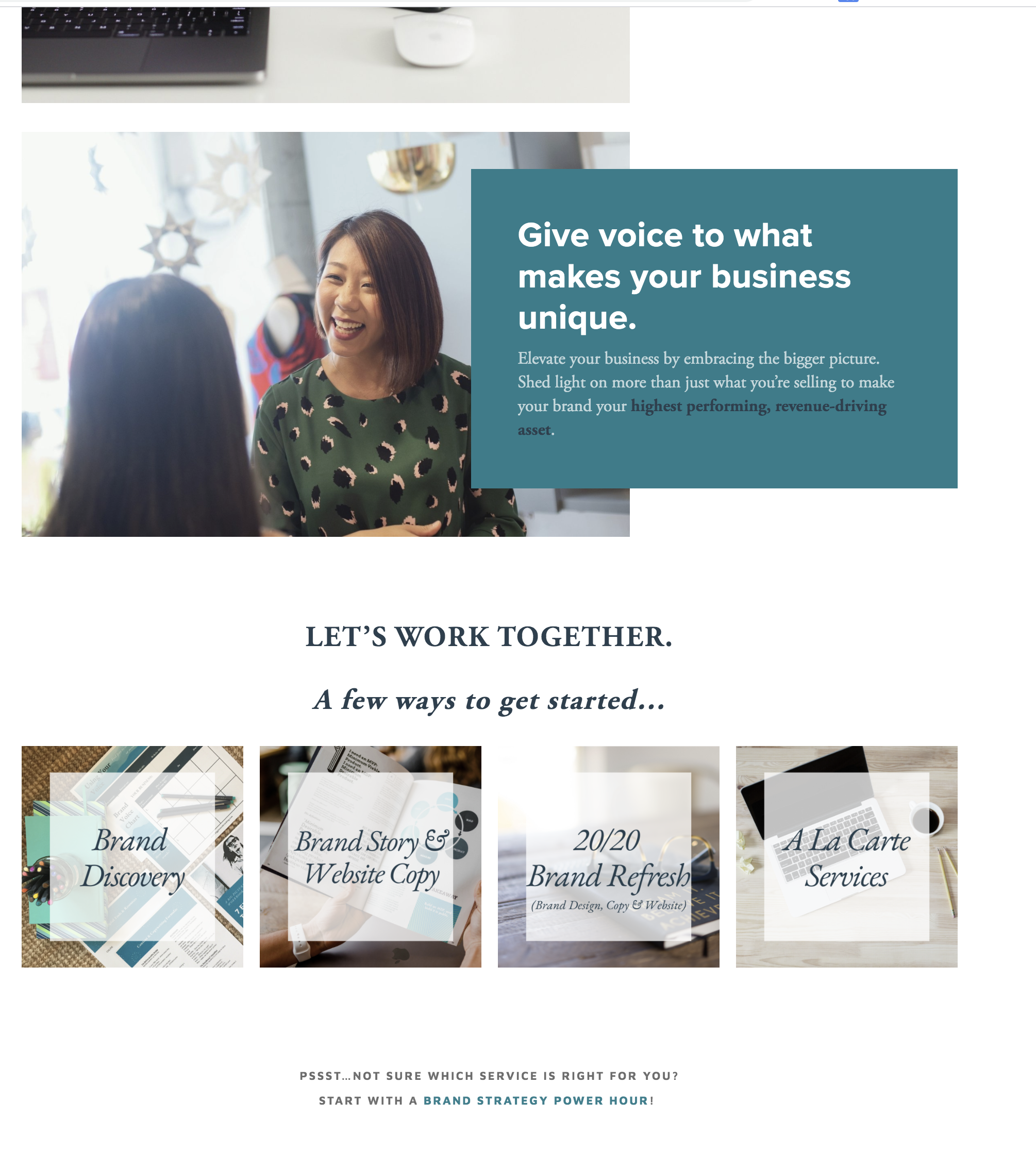 I had her print out the worksheets she sends to her clients to help them to discover their brand. Then, using her office wall, she physically mapped out her the creative process she takes her clients through! Ultimately, she used these images all over her website, including her updated “Services” page.