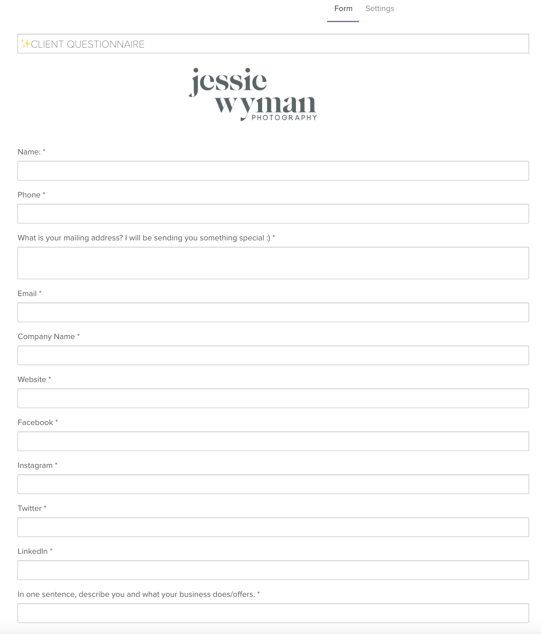 After booking her session, we jumped on a call to chat about that vision and the updates she was making to her brand with her new website. Then I sent her my questionnaire to get even more information. She also gave me her new brand colors.